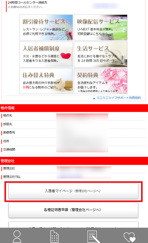 - ミニミニマイページ内にある「入居者マイページ」ボタンより、「ミニテックマイページ」へアクセスできることを確認します。