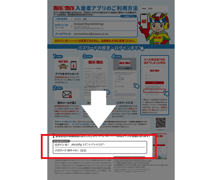- 契約書と一緒に、ご契約者様にお渡しした、アプリのご案内のチラシ裏面下部に、ミニミニマイページログインID・パスワードが記載されていますので入力します。
