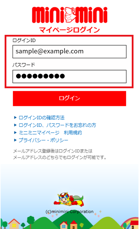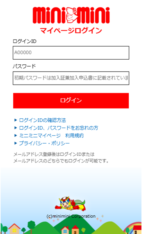- メールアドレス・設定したパスワードで、ミニミニマイページにログインできることを確認します。