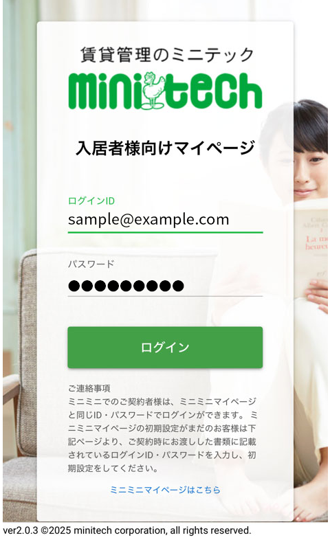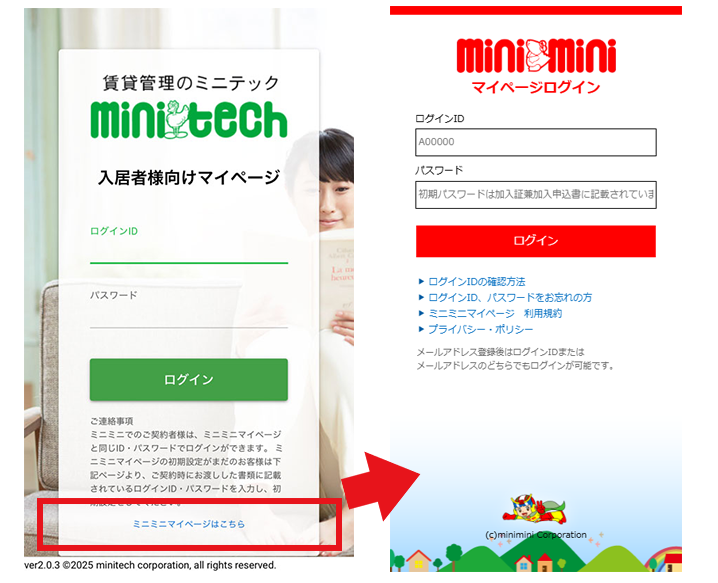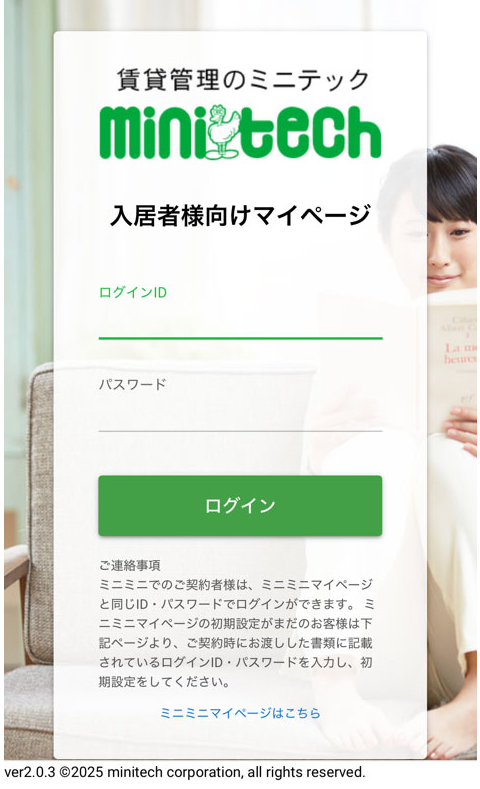 - 管理会社がミニテックのお客様は、ミニテックマイページの画面が開く場合がございます。ミニテックマイページでは家賃の支払い情報などをご確認いただけます。ログインが必要になりますので次の手順でログインをしてください。